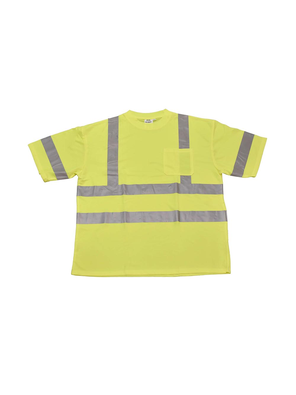 Cordova Safety Products brand, hi-vis COR-BRITE® t-shirts make sure you are safe and seen. This t-shirt features short sleeves sleeves and a hi-vis lime, polyester, birdseye mesh fabric with 2-inch reflective tape and chest pocket.